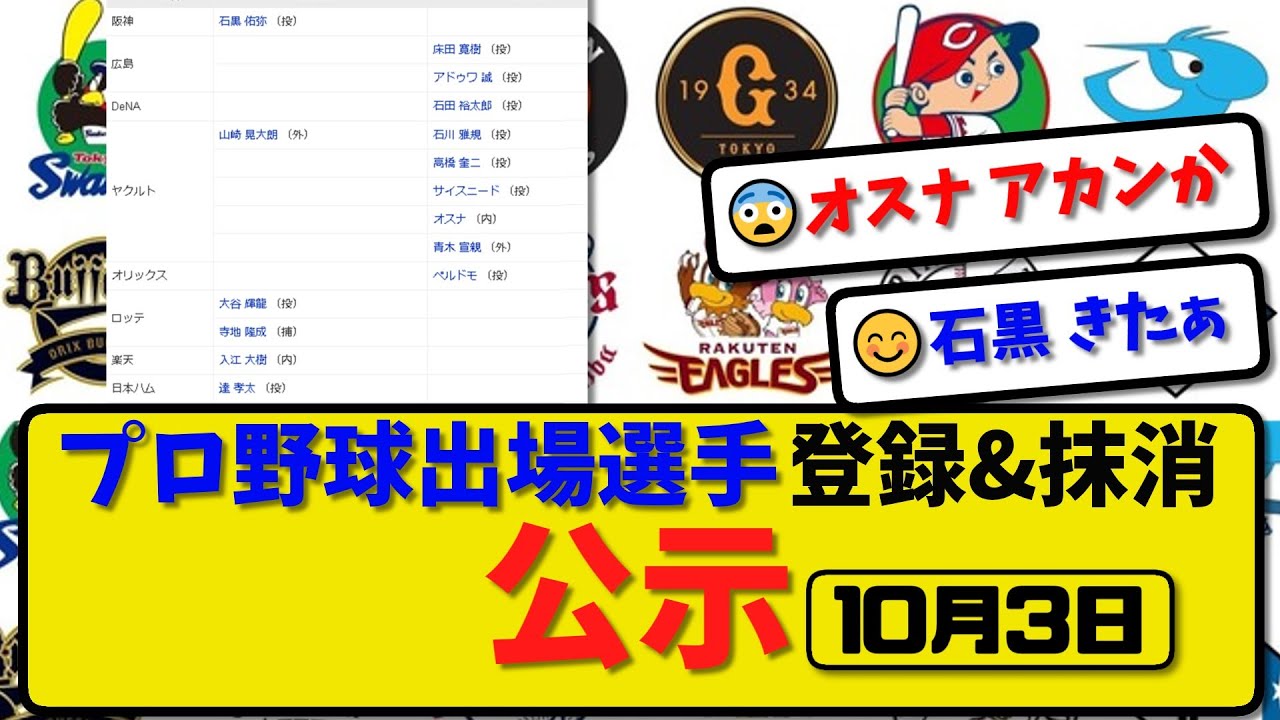 【公示】プロ野球 出場選手登録&抹消 公示10月3日発表|広島床田アドゥワ 横浜石田 ヤク石川高橋サイスニオスナ青木ら抹消|阪神石黒 ヤク山崎 ロッテ大谷寺地 楽天入江ら登録【最新・まとめ・反応集】