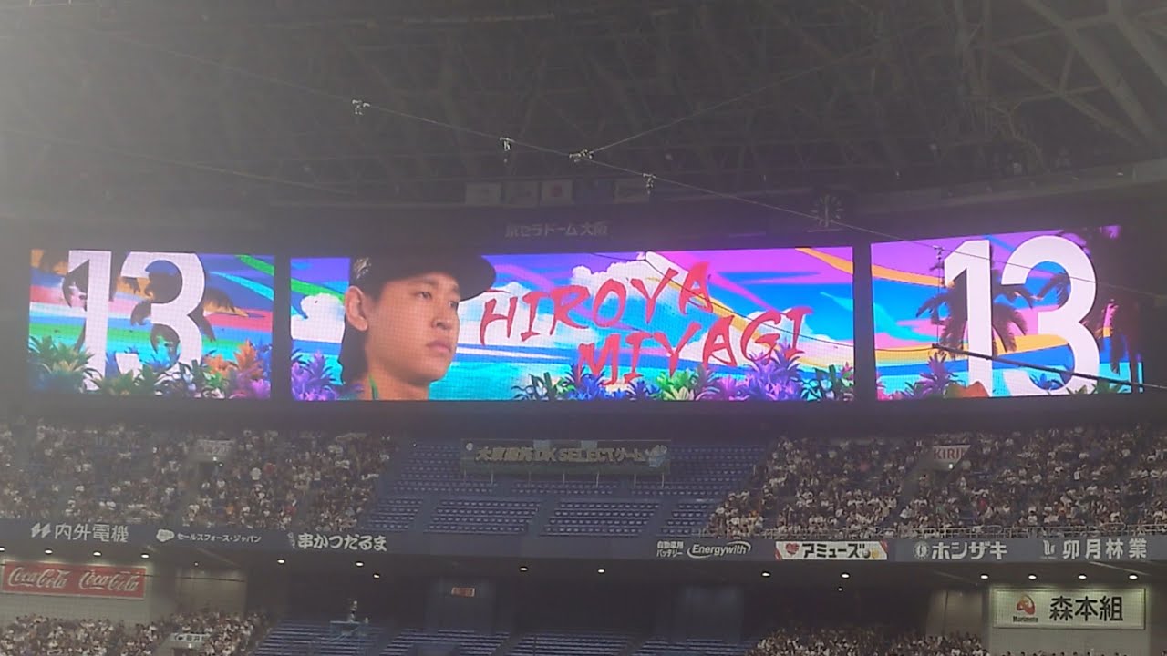 宮城大弥 投手 「Hi-STANDARD STAY GOLD」 今季引退の比嘉幹貴投手の登場曲 09/22初回限定 オリックス・バファローズ 選手 ビジョン映像 PV 演出 @京セラドーム 2024 舞洲豪雨からの京セラDハシゴでレンズの中の曇りが取り切れなくて画面が白っぽくなってしまって恐縮です ORIX Buffaloesオリックス・バファローズ比嘉幹貴 NPBHUB.COM | The Fanbase of Nippon Baseball & Nippon Professional Baseball