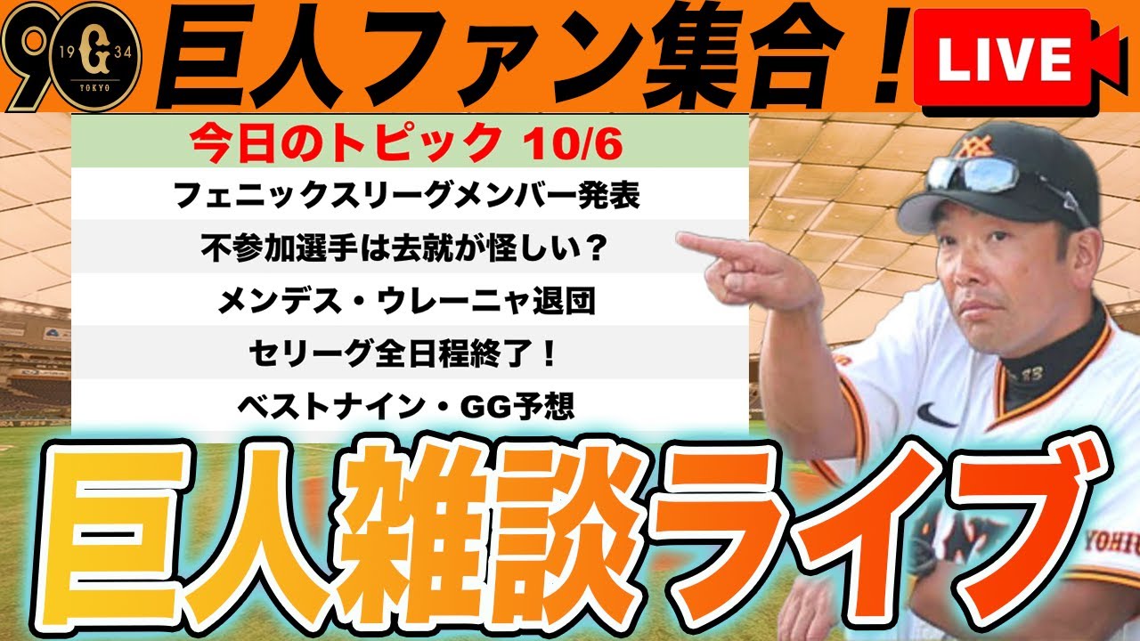 【巨人ファン集合】フェニックスリーグ参加メンバー発表!メンデス・ウレーニャ退団!ベストナイン・ゴールデングラブ予想など巨人雑談ライブ 読売ジャイアンツ