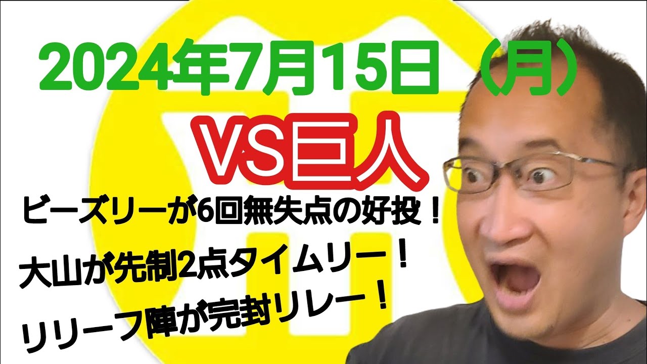 【阪神タイガースについて語る動画】2024年7月15日(月) ● 巨人 0 × 2 阪神 ○ ビーズリーが6回無失点の好投! 大山が先制&決勝の2点タイムリー! 石井、桐敷、ゲラが完封リレー!