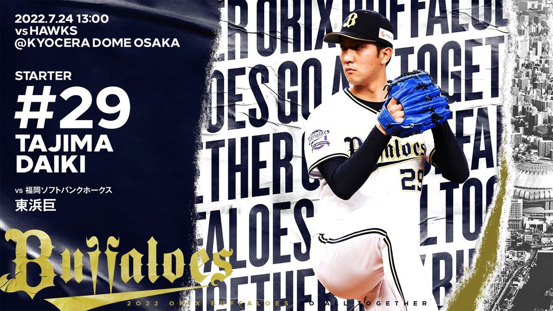 #7月24日 #福岡ソフトバンク戦 #予告先発投手 #田嶋大樹 #京セラドーム大阪 #13時00分試合開始 #Bs2022 #buffaloes #baseball #ORIX #プロ野球 13時00分試合開始7月24日baseballBs2022buffaloesNPB Pacific LeagueOfficial MediaORIXORIX BuffaloesORIX Buffaloes Official Mediaオリックス・バファローズプロ野球予告先発投手京セラドーム大阪田嶋大樹福岡ソフトバンク戦 NPBHUB.COM | The Fanbase of Nippon Baseball & Nippon Professional Baseball