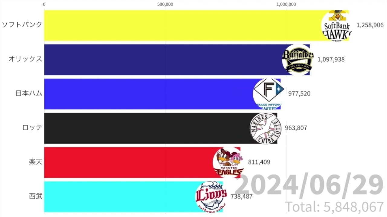 パリーグ2024「ホーム観客動員数」推移チャート 2024年のパリーグの「ホーム観客動員数」推移の動画です。 #オリックス #ロッテ #西武 #ソフトバンク #日本ハム #楽天 #パリーグ #2024 #パリーグ #優勝 #プロ野球 #セリーグ #2024 #観客 ORIX Buffaloesオリックス・バファローズ NPBHUB.COM | The Fanbase of Nippon Baseball & Nippon Professional Baseball