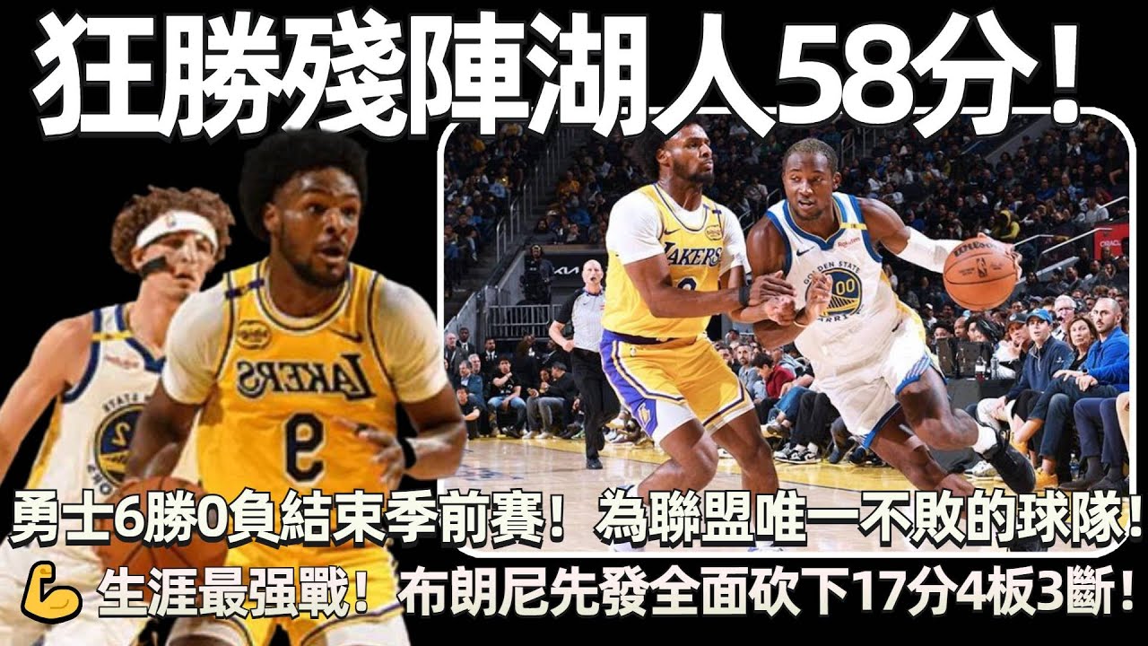 狂勝殘陣湖人58分! 全隊37助攻全面開花,科爾場邊笑得合不攏嘴! 勇士6勝0負結束季前賽! 為聯盟唯一不敗的球隊! 💪 生涯最强戰! 布朗尼先發砍下17分4板3斷!有誰注意到席菲諾,雷迪克都看懵了!
