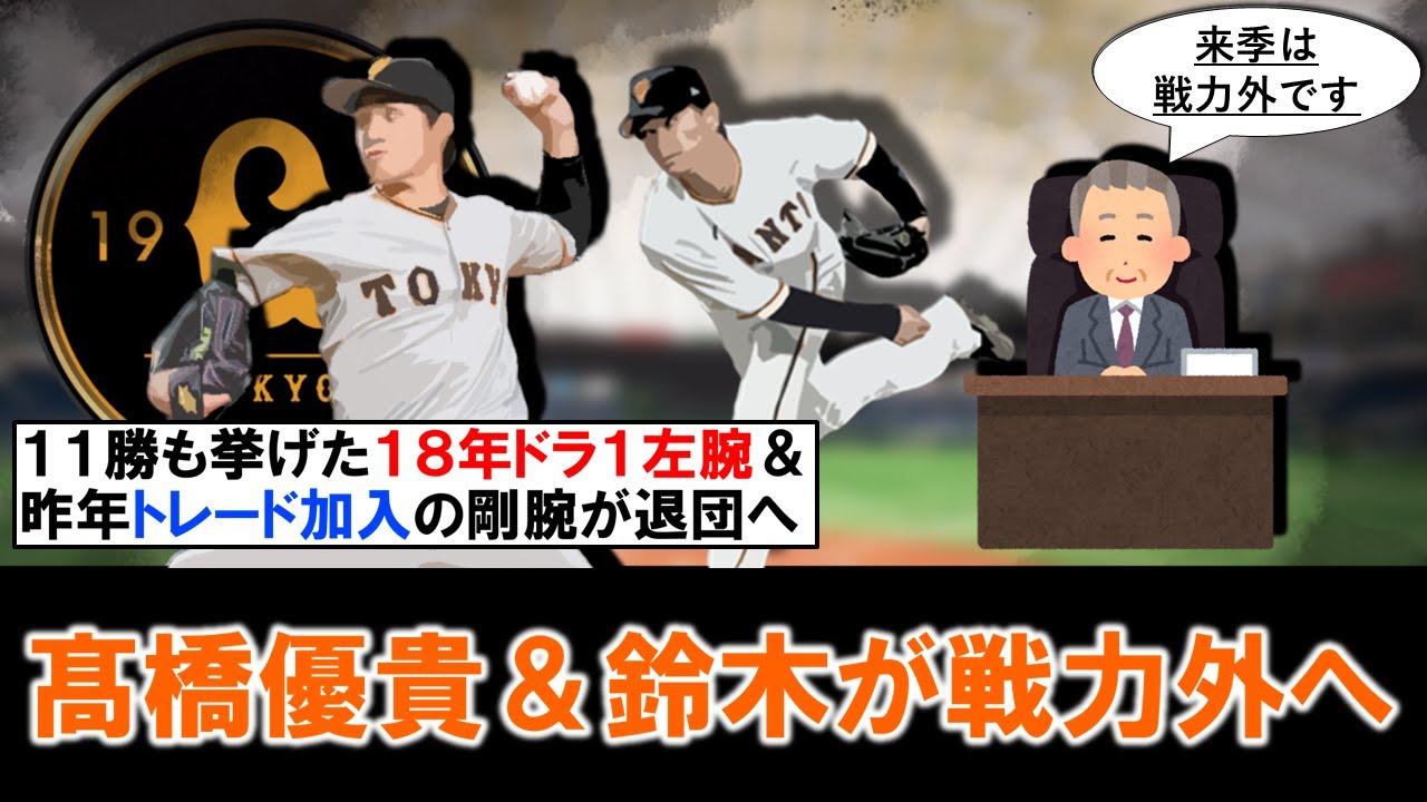 【次々と通告続く】巨人『髙橋優貴』&『鈴木康平』が戦力外!髙橋は2019年ドラフト1位で入団し21年には11勝を記録したが今季は1軍登板無し、鈴木は昨年オリックスから加入も今季1軍登板無く退団へ…
