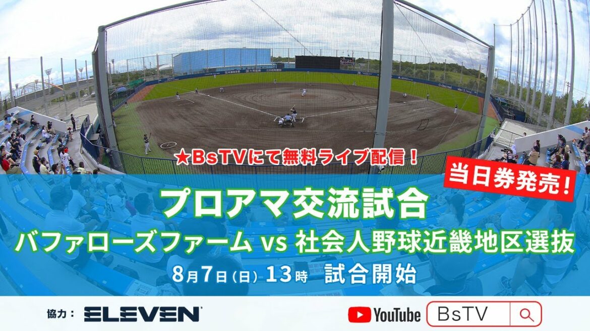 杉本商事バファローズスタジアム舞洲で行われるプロアマ交流試合を、イレブンスポーツ協力のもと、球団公式YouTubeチャンネル「BsTV」にて独占ライブ配信を行います。