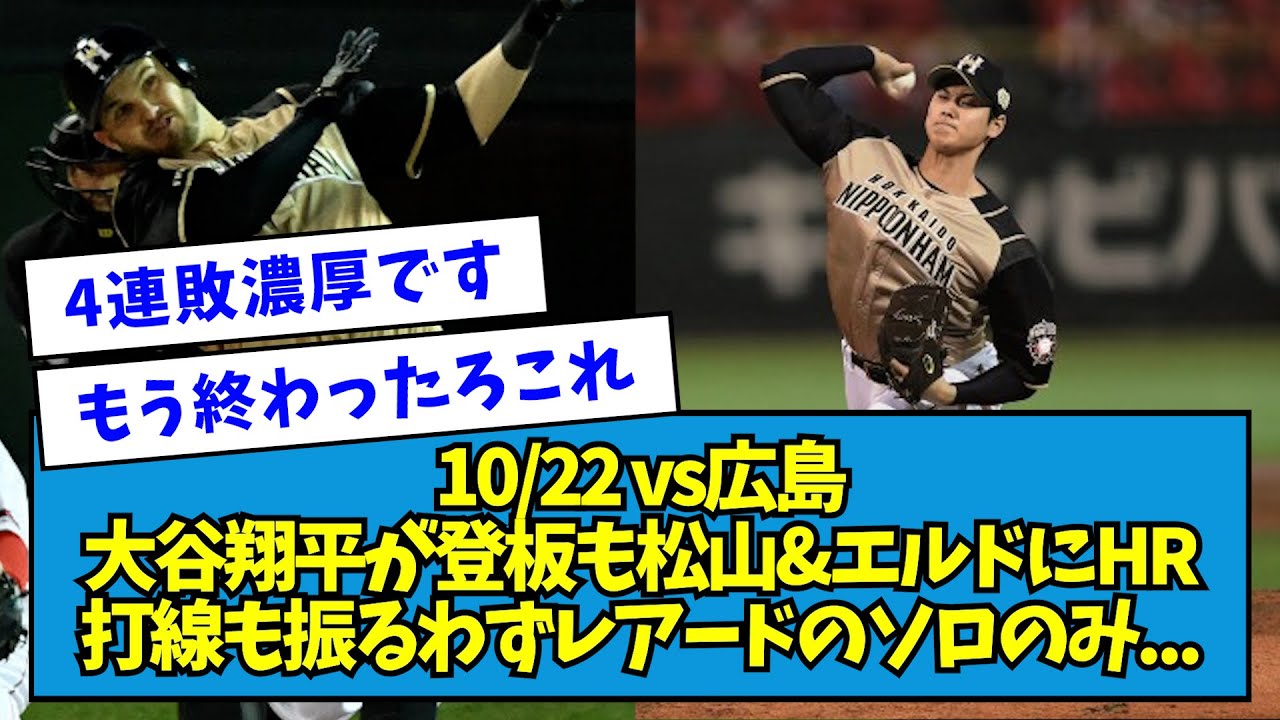 【試合まとめ】10/22 vs広島 大谷翔平が登板も松山&エルドレッドにHR 打線も振るわずレアードのソロのみ…【なんJ反応】
