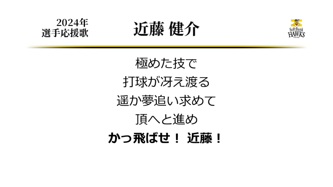 福岡ソフトバンクホークス 近藤健介 応援歌 [MIDI] 近藤選手のソフトバンク移籍後の応援歌です。 WBC世界一も今季パ圧倒的優勝も、近藤の存在なくしては語れませんが、 一方、自身は健闘しながら、日本シリーズで敗れたり昨シーズンは優勝を逃したり、 近藤一人の力だけで完全無欠のチームとはならないのが、野球の面白いところ。 ○近藤応援歌(日本ハム時代)→https://youtu.be/JzIGBNzyCYU Fukuoka SoftBank HawksFukuoka SoftBank Hawks (Baseball Team)Kensuke Kondoh (Baseball Player)なんぶふじ応援歌福岡ソフトバンクホークス近藤健介 NPBHUB.COM | The Fanbase of Nippon Baseball & Nippon Professional Baseball