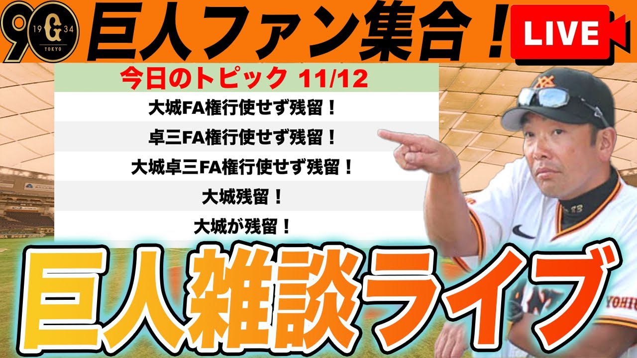 【巨人ファン集合】大城FA権行使せず残留!甲斐はFA宣言!獲得に動くのか?!大山は?など雑談ライブ 読売ジャイアンツ