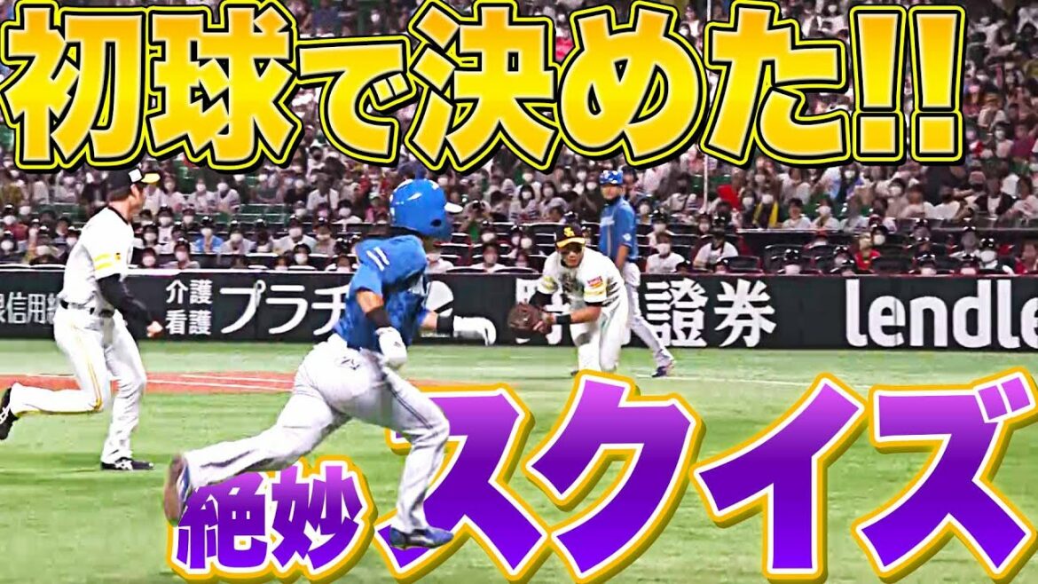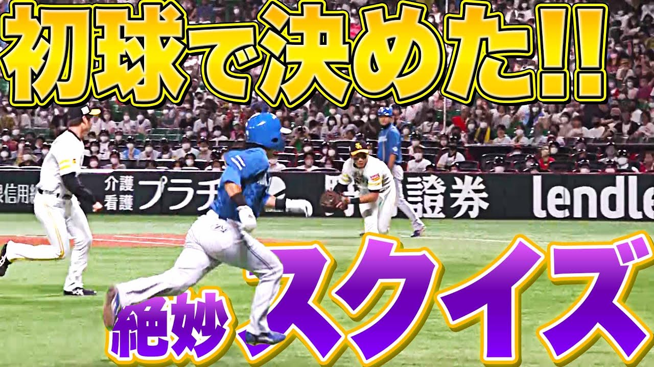 初球で決めた、絶妙スクイズ。1死1,3塁の場面で北海道日本ハム・佐藤龍世がスクイズを敢行。打球を追うピッチャーが捕れずに1塁手が処理する最高の位置への転がし。流れを切らずにしっかりと1球で決め、BIGBOSSの思い描いた通りの結果となったに違いない。