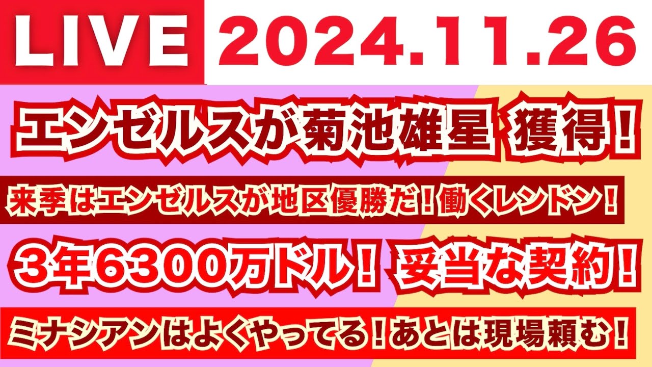【2024.11.26】朝から生MLB!/菊池雄星がエンゼルスへ!/来季はエンゼルスが優勝だ!働くレンドン!/3年6300万ドル!妥当な契約!/暮らし安心ミナシアンはよくやってる!あとは現場頼む!