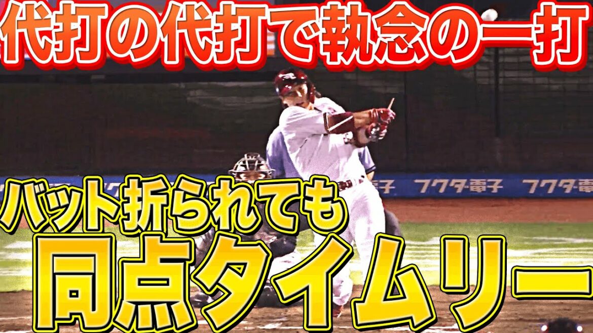 2点を先行されて迎えた7回裏、東北楽天は”代打の代打”として炭谷銀仁朗が打席へ。バットを折りながらも弾き返した打球は見事三塁手の頭を越える!! 一塁上で拳を高く掲げた値千金の同点タイムリーをお届け。