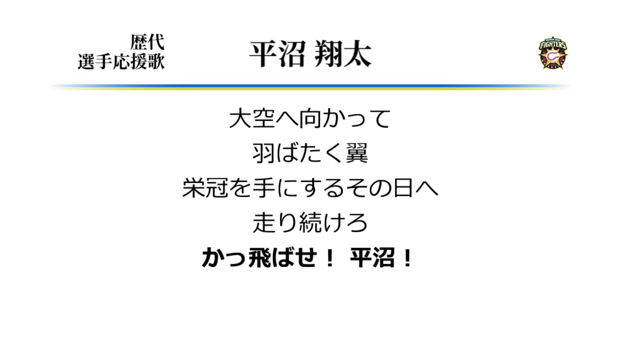 北海道日本ハムファイターズ 平沼翔太 応援歌 [MIDI] 平沼選手の日本ハム時代の応援歌です。 同年発表のビヤヌエバは、助っ人選手の応援歌ということで 流用スパンが短くなるのはある種織り込み済みだと思うのですが、 こちらの応援歌は早く誰かが自分のものとしてほしいところ。 Hokkaido Nippon-Ham FightersHokkaido Nippon-Ham Fighters (Baseball Team)Shota Hiranuma (Baseball Player)なんぶふじ北海道日本ハムファイターズ平沼翔太応援歌 NPBHUB.COM | The Fanbase of Nippon Baseball & Nippon Professional Baseball