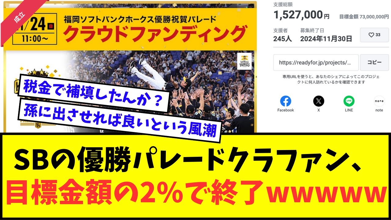 【悲報】ソフトバンクの優勝パレードクラファン、目標金額の2゙終了wwwww【なんJ反応】【2chスレ】【5chスレ】【プロ野球反応集】