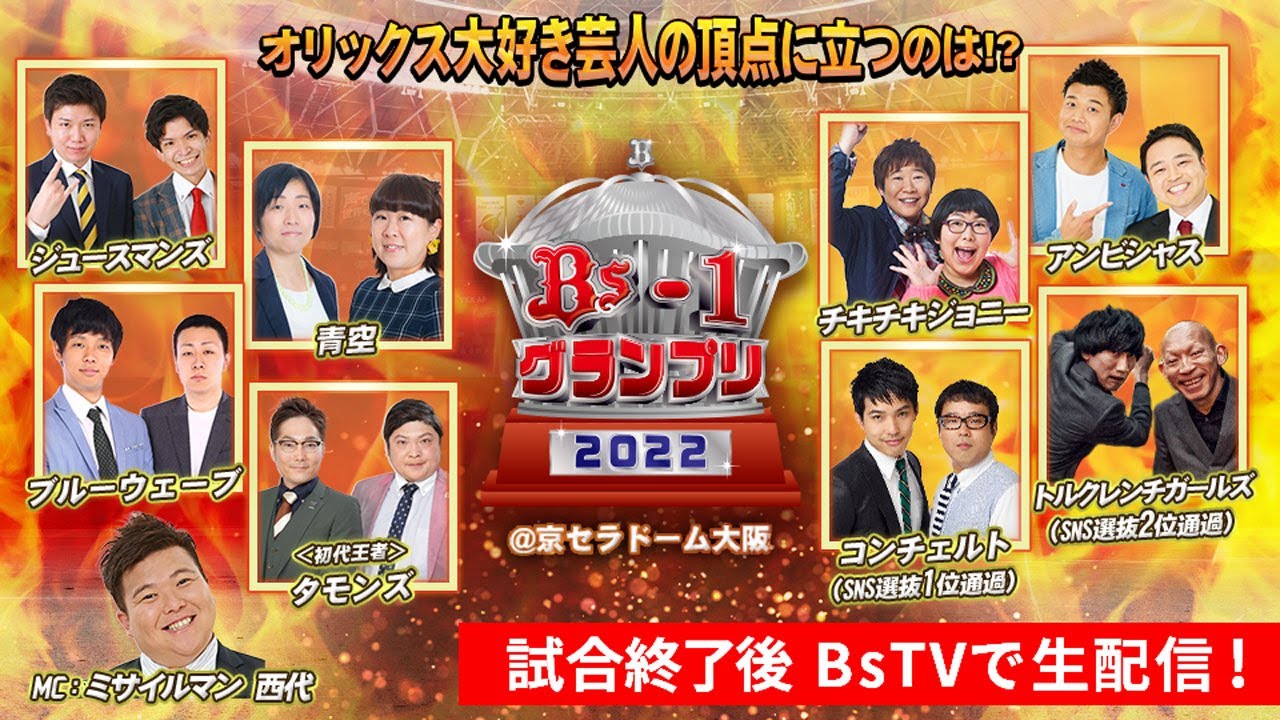 8月27日(土)試合終了後に「第2回Bs-1グランプリ」を開催いたします。オリックス大好き芸人たち8組によるネタバトル!当日はファン投票にて「2代目王者」を決定いたします!頂点を掴むのはどの芸人か?!ぜひお見逃しなく!