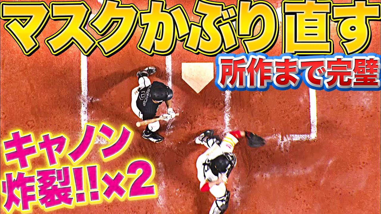 相手の走者のスタートが早かろうが遅かろうがお構いなし。驚異的な腕の振りで甲斐キャノンを繰り出し、次々に走者の進塁を防いでいく福岡ソフトバンク・甲斐拓也。盗塁を阻止するまでだけでなく、今回は無いが、さらさらヘアーをかきあげるシーン、マスクを被り直すまでが見どころの1セット。今後の甲斐キャノン、そこまで含めてお見逃しなく。