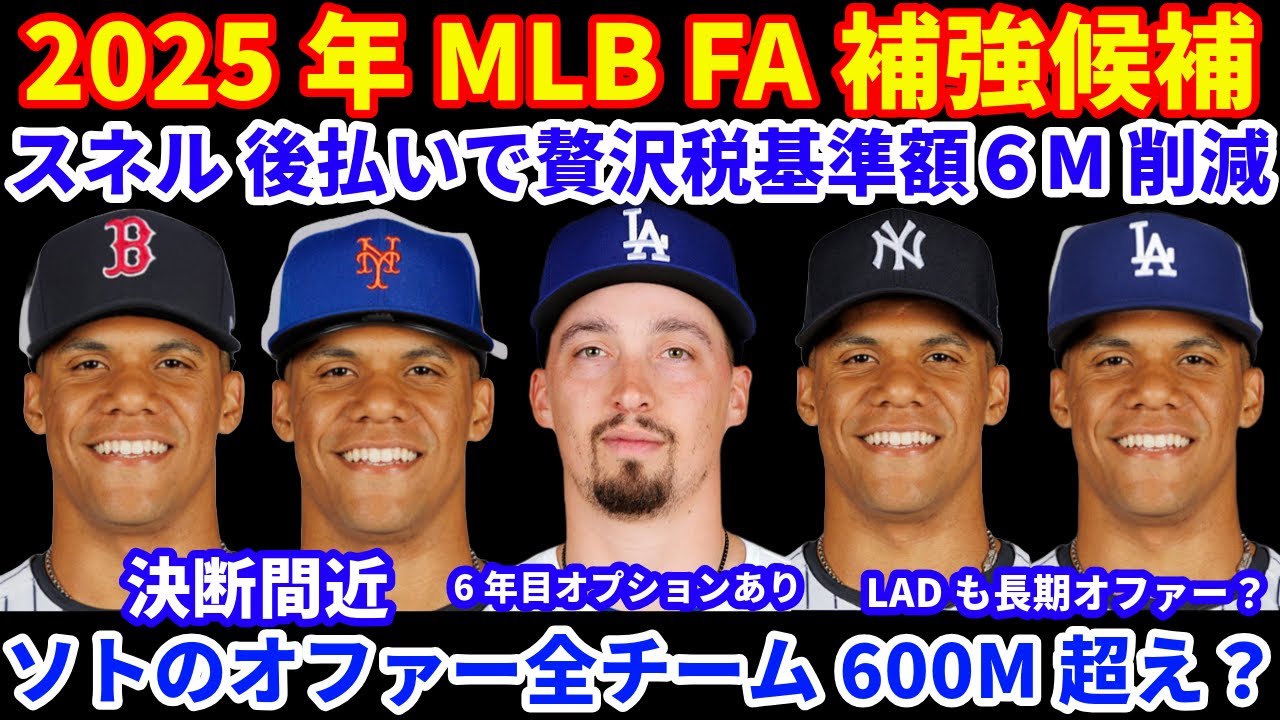 2025年MLB FA補強情報‼️ スネルの契約に6年目オプションあり💰贅沢税換算も減少💰 ソト争奪戦 現在残るチームのオファーは全て600M超えか💰 チャップマンがBOSと1年契約‼️