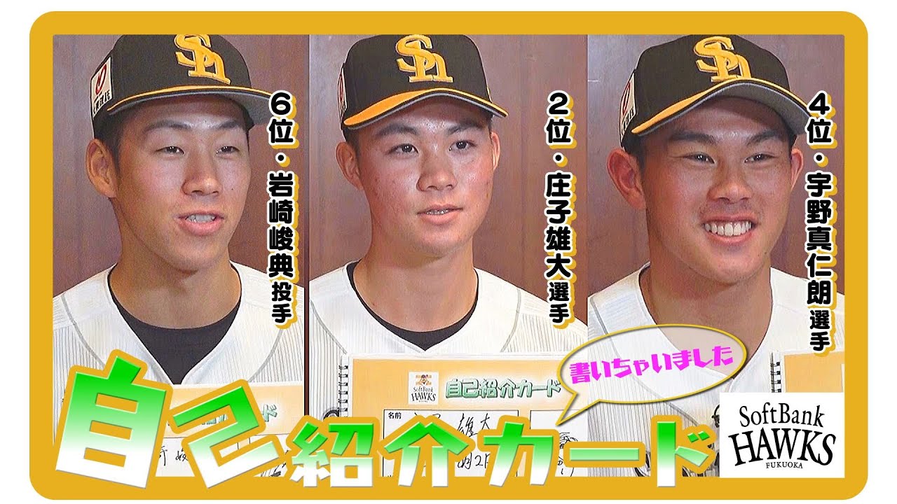 【自己紹介カード】僕たちが2025年入団のルーキーです!【前編】 2025年入団の新人選手たちに自己紹介カードを書いてもらいました! 前編はドラフト2位 庄子雄大選手・ドラフト4位 宇野真仁朗選手・ドラフト6位 岩崎峻典投手! この機会に新人選手たちを覚えて頂けると嬉しいです♪ #庄子雄大 #宇野真仁朗 #岩崎峻典 #福岡ソフトバンクホークス #sbhawks Fukuoka SoftBank HawksFukuoka SoftBank Hawks Official ChannelFukuoka SoftBank Hawks Official VideoOfficial ChannelOfficial VideoPACIFIC LEAGUE福岡ソフトバンクホークス NPBHUB.COM | The Fanbase of Nippon Baseball & Nippon Professional Baseball