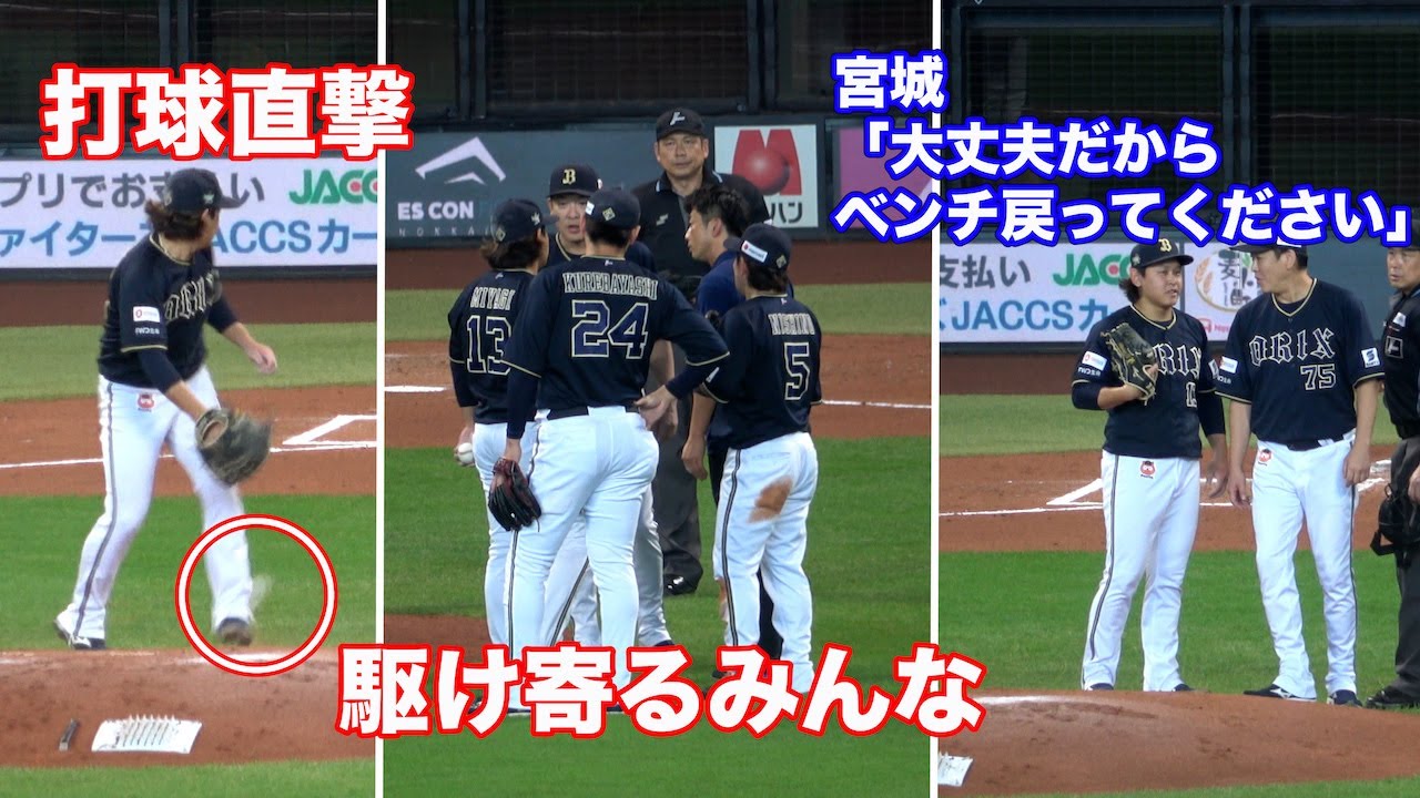 打球が宮城の左足に直撃!心配して宮城の元に集まる内野陣とコーチ→宮城「大丈夫だからベンチ戻ってください」 2024年9月8日 日ハムvsオリックス エスコンフィールドHOKKAIDO #宮城大弥 #レイエス #西野真弘 #紅林弘太郎 #太田椋 #若月健矢 #オリックスバファローズ #北海道日本ハムファイターズ ORIX Buffaloesオリックス・バファローズ宮城大弥 NPBHUB.COM | The Fanbase of Nippon Baseball & Nippon Professional Baseball