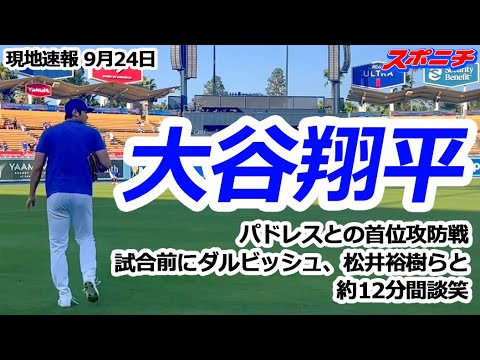 ドジャースの大谷翔平投手(30)は24日(日本時間25日)、地区優勝を懸けて本拠で3ゲーム差の2位・パドレスと直接対決3連戦。首位攻防戦となるが、試合前の練習ではリラックスムードでパドレス・ダルビッシュ有投手(38)と談笑する場面も見られた。