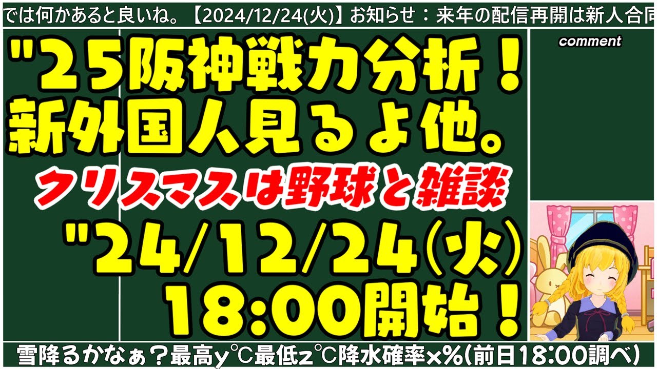 【”25阪神戦力分析、他】”24/12/24(火) クリスマスは野球と雑談! 新外国人チェック他【まいちゃんラジオ】