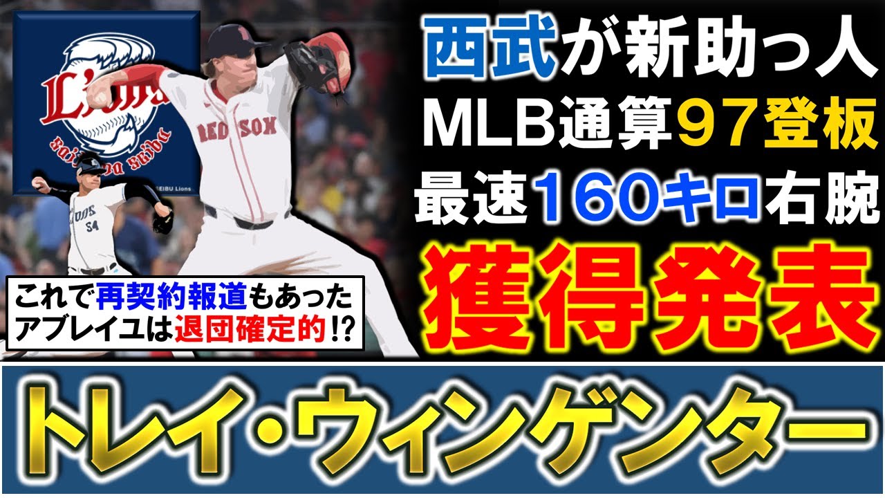 【新年1発目の補強!】西武が新助っ人として『トレイ・ウィンゲンター』を獲得発表!MLB通算97登板の最速160キ里ロ右腕は勝ちパターンとして期待大!ただこれで再契約報道もあったアブレイユは退団確定!?