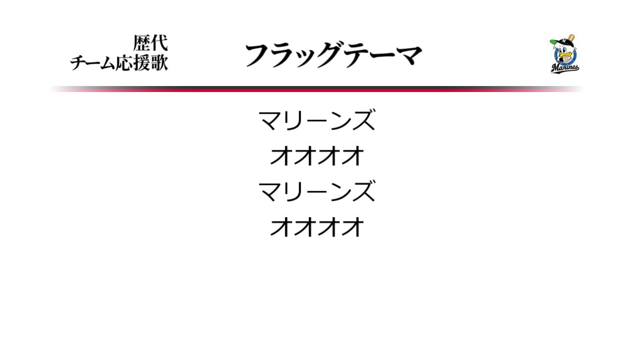 千葉ロッテマリーンズ フラッグテーマ (’07作) [MIDI] ロッテの初代フラッグテーマです。 青春時代を象徴するかのような一曲などともっともらしいこと言っていますけど、 冷静に考えて、青春時代を象徴する一曲が応援歌だなんて世の理解は得られなさそう。 Chiba Lotte MarinesChiba Lotte Marines (Baseball Team)なんぶふじフラッグテーマ千葉ロッテマリーンズ応援歌 NPBHUB.COM | The Fanbase of Nippon Baseball & Nippon Professional Baseball