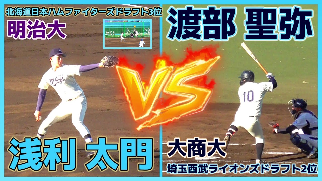 【2024北海道日本ハムファイターズドラフト3位vs埼玉西武ライオンズドラフト2位の対戦シーン/マルチアングル(球速表示有り)】明治大・浅利太門(興國高)vs大阪商業大・渡部 聖弥(広陵高)