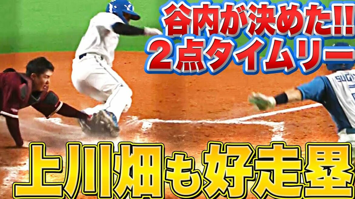 1,2塁、得点圏に走者を置いた場面で北海道日本ハム・谷内亮太が打席へ。得点圏打率.478の数字が示す通り、このチャンスでもしっかりと結果を残しタイムリーを放つ!! やや送球がそれる間に、1塁ランナーの上川畑大悟まで生還し2点を奪った!!