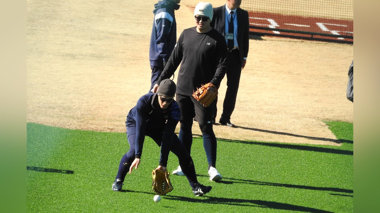 新人合同自主トレの初日となった1月8日、村上宗隆と塩見泰隆がヤクルト戸田球場に登場。外野でのキャッチボール後、ベンチ前でノックを受けていました。