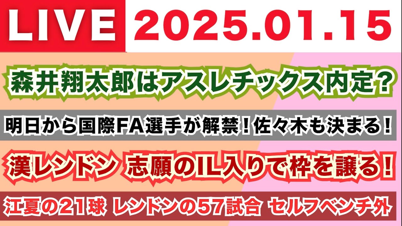 【2025.01.15】森井翔太郎はアスレチックス内定?/明日から国際FA選手が解禁!佐々木も決まる!/漢レンドン 志願のIL入りで枠を譲る!/江夏の21級 レンドンの57試合 セルフベンチ外