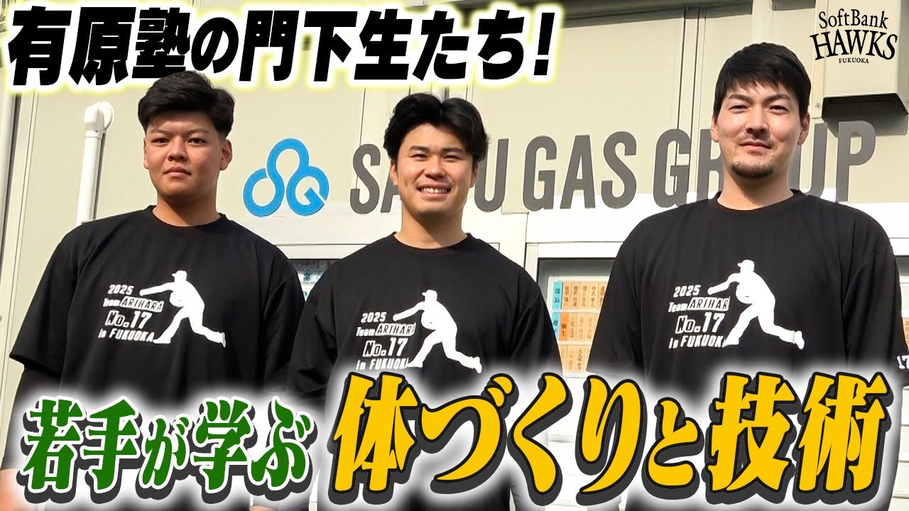 2025シーズンの開幕投手と小久保監督から明言されている #有原航平 投手が福岡市内のSCマリンフィールド東浜(西部ガス野球部練習場)で自主トレを公開しました!初めての弟子を連れての自主トレということで、 #松本晴 投手・ #盛島稜大 選手にもお話聞いてきました。