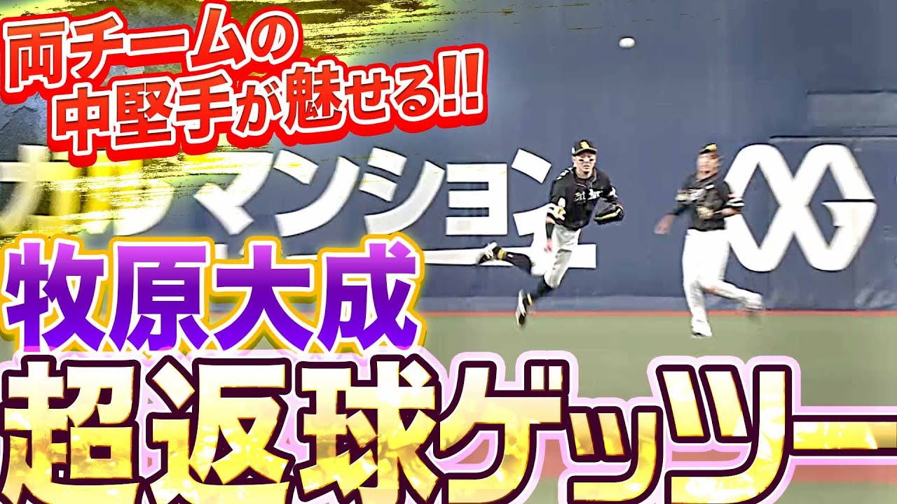 走者を3塁に置き、センターへ打球が飛ぶ。捕球と同時に3塁走者がスタートを切り、右中間付近で捕球した福岡ソフトバンク・牧原大成がホームへ低く正確な送球!! これ以上ない返球で走者を刺し、生還を阻止。両軍のセンターが好プレーを披露している!!