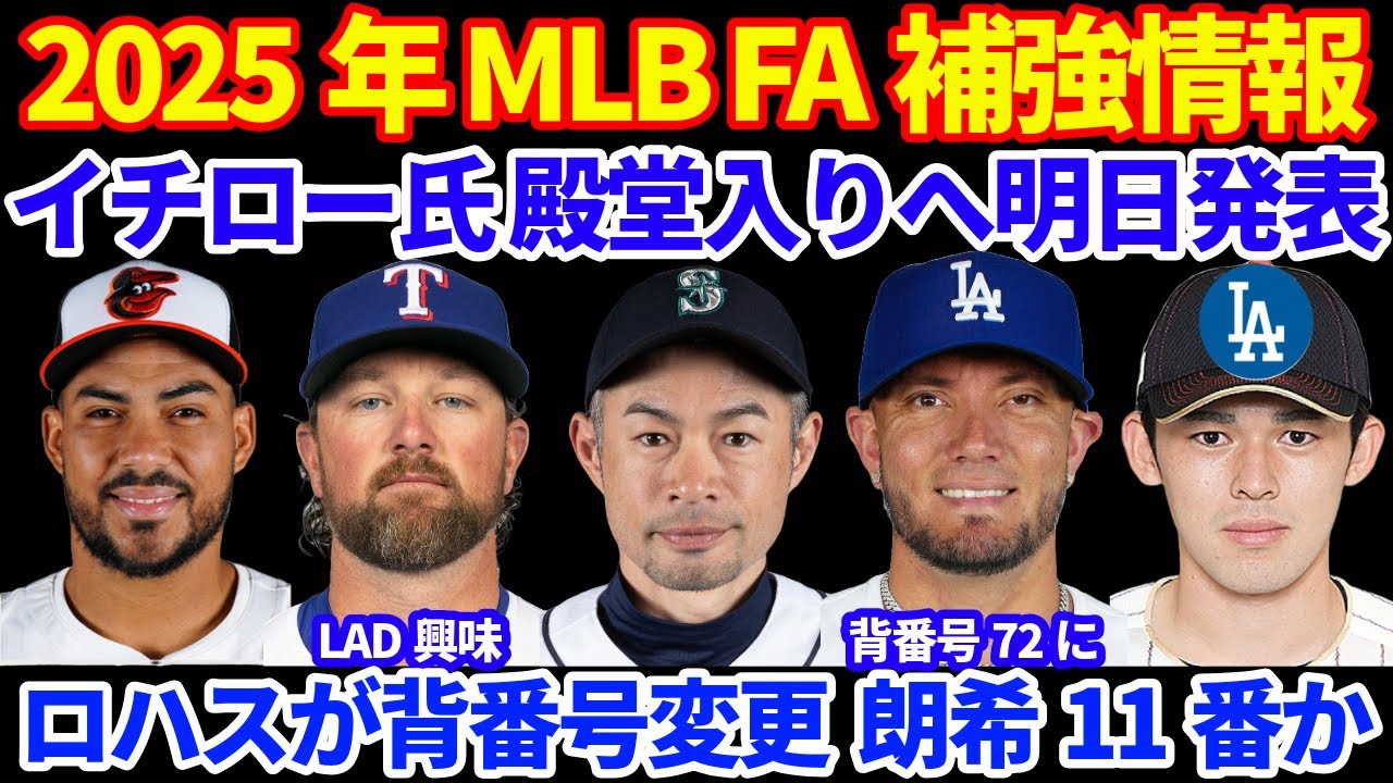 2025年MLB FA補強情報‼️ロハスが公式サイトで背番号72に変更で佐々木朗希11番確実か‼️ ドジャース inFA合計16名と契約💰 イエーツに興味💰日本時間22日朝8時 イチロー氏殿堂入り発表