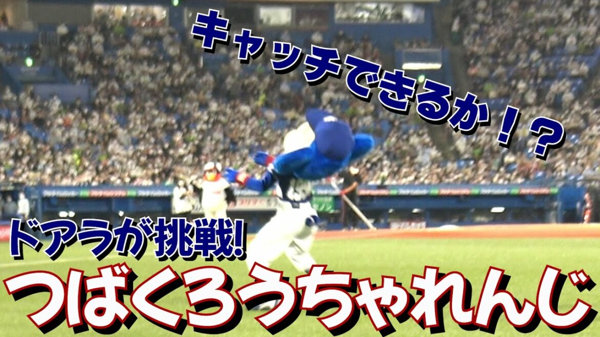 イニング間につば九郎から放たれるTシャツをキャッチ出来たら、試合終了まで生ビールが500円になる「つばくろうちゃれんじ」に、ドアラが挑戦しました!