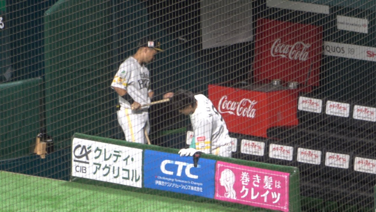 中村晃がバットに魂を宿す瞬間のベンチ(牧原大成)プロ野球福岡ソフトバンクホークス@PayPayドーム 試合前 「道具を大切にする選手」
