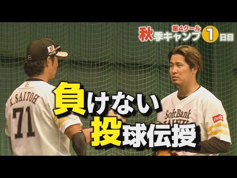 この日から最終クールがスタート!!この日誕生日の#甲斐野央 投手はコーチから誕生日特別メニューを提案⁉思わず苦笑い…。#斉藤和巳 コーチはこの日もブルペンで熱血指導!連日ブルペンで汗を流す#杉山一樹 投手は斉藤コーチの教えに真剣な眼差し!