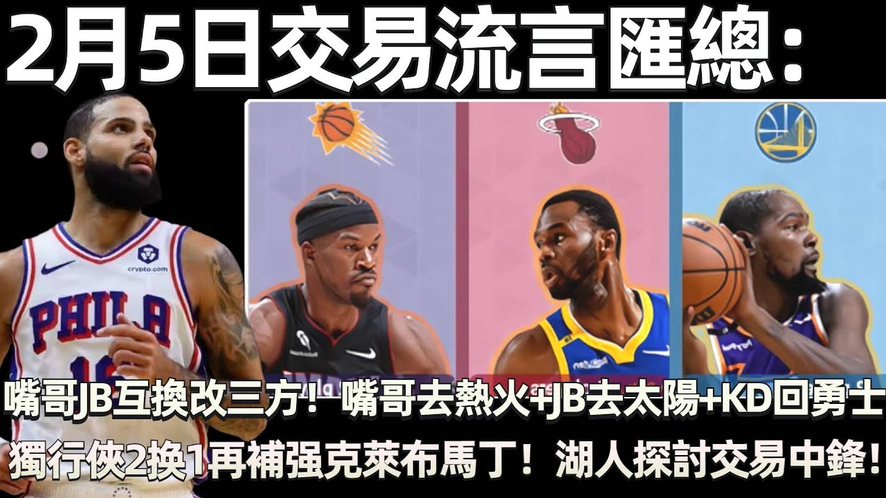2月5日交易流言匯總:嘴哥+JB互換被叫停改成三方交易! 嘴哥去熱火+JB去太陽+KD回勇士? 獨行俠再補强! 送走格拉姆斯得到克萊布馬丁! 湖人火箭探討交易中鋒! 雄鹿追庫茲馬!