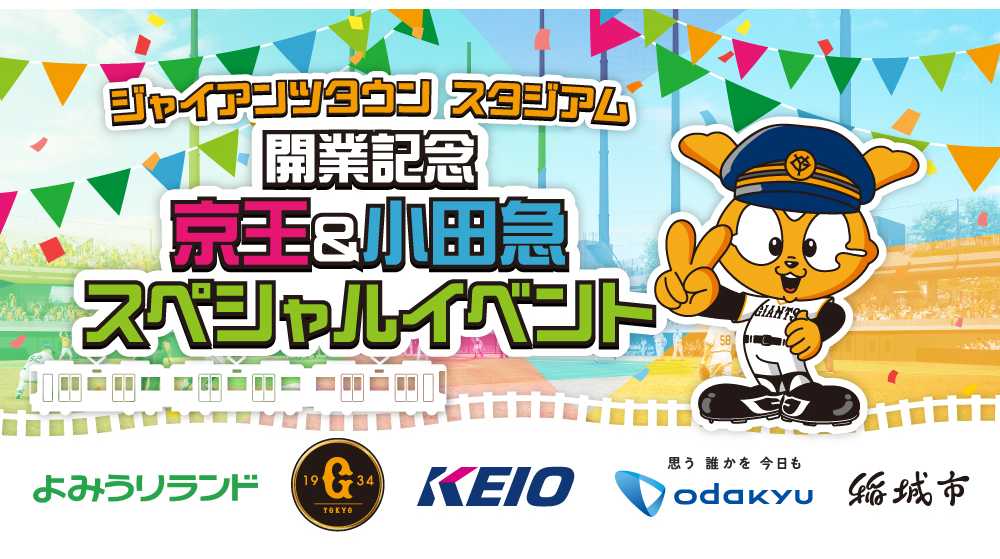 株式会社よみうりランド、株式会社読売巨人軍、京王電鉄株式会社、小田急電鉄株式会社、稲城市は、3月1日(土)の「ジャイアンツタウンスタジアム」開業を記念し、同日からジャイアンツタウンスタジアムへアクセス可能な京王線・小田急線でスタンプラリーを実施するほか、京王線では読売ジャイアンツのOBが同乗する特別列車を運行するなど、「祝!Gタウン開業 京王&小田急スペシャルイベント」(以下、「本企画」)を実施します。