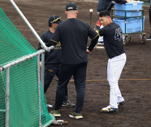 具志川キャンプでサンズ臨時コーチに指導を受ける阪神佐野(2025年2月6日撮影)