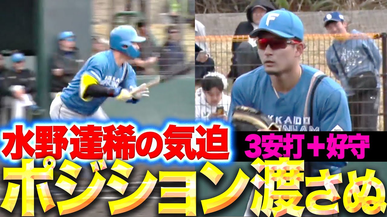 イーグルスとの練習試合、9番・ショートで出場した北海道日本ハム・水野達稀が攻守に大活躍。1打席目でセンターへのタイムリーを放ち、続く打席でも安打。さらに7回にはフェンス直撃後、グラウンドに全く落ちない珍しい当たりで3ベースヒットに。さすがのパワーを見せつける。さらに守備では、逆シングルの難しい当たりを難なくさばく好プレー!! 首脳陣もファンも期待を寄せる水野が、しっかりと結果を残した。