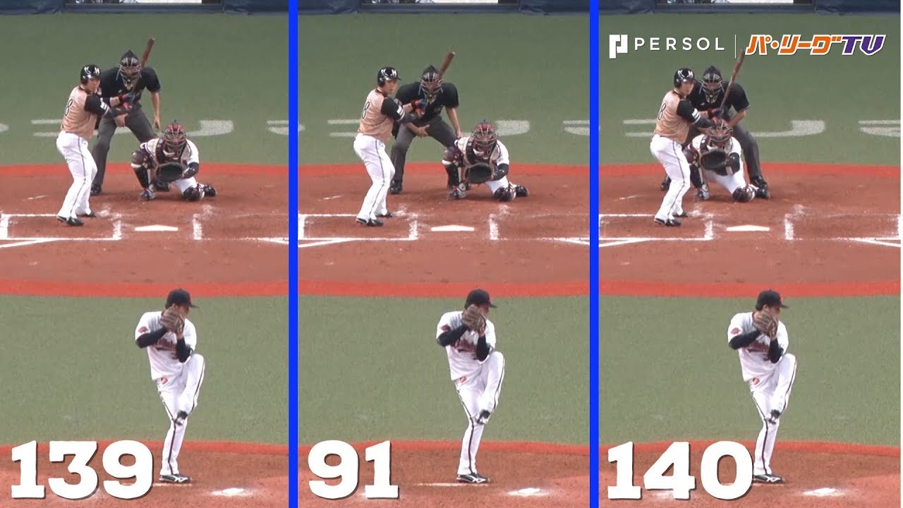 3番手としてマウンドに上がったオリックス・比嘉幹貴。北海道日本ハム・近藤健介と対峙した場面で、139キロ、91キロ、140キロの鬼緩急で3球勝負。見事三振に仕留めた凄すぎる投球をお届け!!