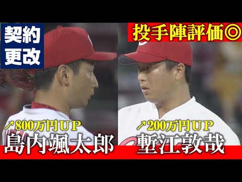 30日の契約交渉で、塹江敦哉投手は200万円アップの2100万円で、島内颯太郎投手は800万円増の2400万円でサインしました。