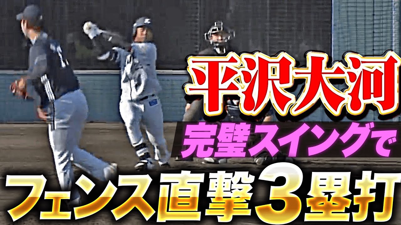 今季初の対外試合に途中出場の埼玉西武・平沢大河。2球目を完璧スイングで振り抜くと打球は左中間を真っ二つ!! あと少しでスタンドインというフェンス直撃打で自身は一気に3塁へ!! 存在感をアピールする1打となった!!