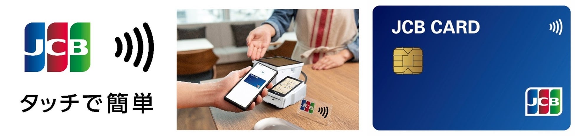 JCBのタッチ決済(JCBコンタクトレス)は、お持ちのJCBカードや、JCBカードを登録したスマートフォンなどをお店の端末にかざすだけでショッピングができる非接触決済です。