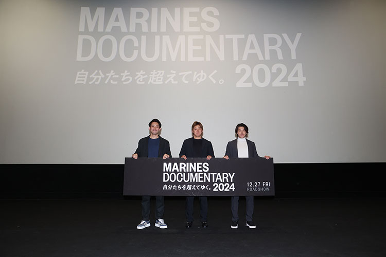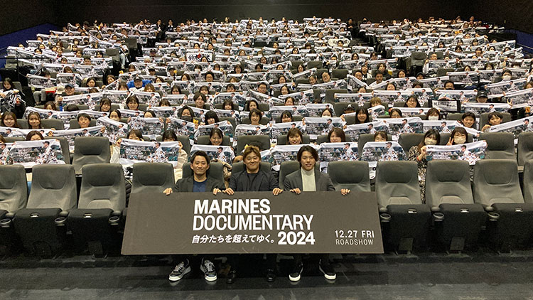 12月19日(木)、ユナイテッド・シネマ幕張スクリーン10にて、千葉ロッテマリーンズドキュメンタリー映画「MARINES DOCUMENTARY2024 自分たちを超えてゆく。」の完成披露試写会を行い、小島和哉投手、鈴木昭汰投手、小川龍成選手が登壇しました。