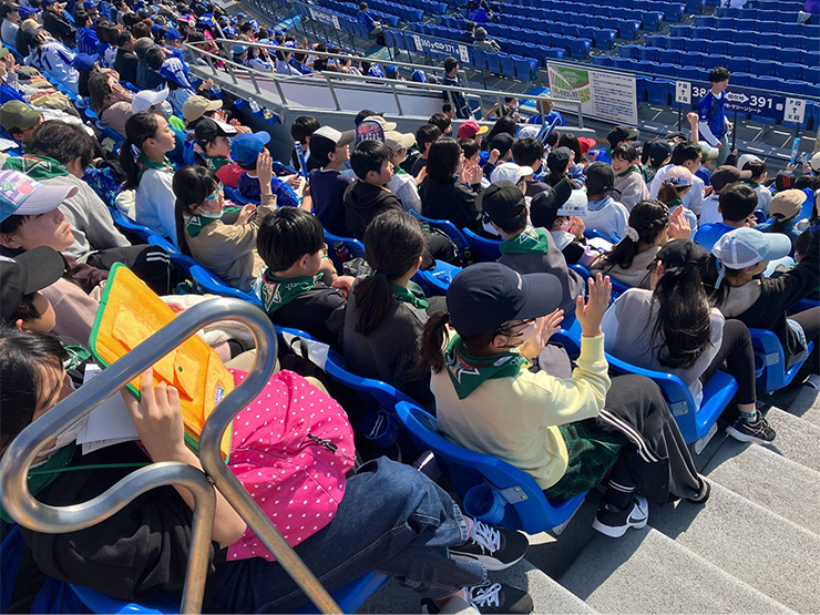 横浜スタジアムで働くクルーのおしごとを直に学びながら、一生懸命声援を送ってくれました。