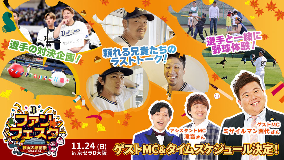 今年もゲストMCはミサイルマンの西代さん、そしてアシスタントMCに滝音さん!Bs-1グランプリの名MC・西代さんと、今シーズンの4代目王者・滝音さんが、オリックス愛あふれる選手へのボケとツッコミでファンフェスタを大いに盛り上げていただきます!