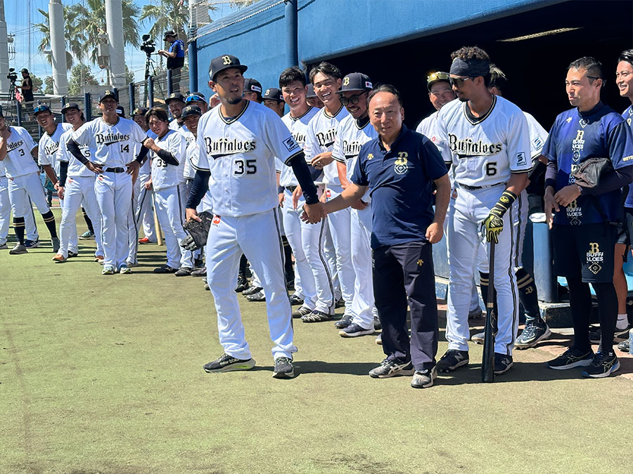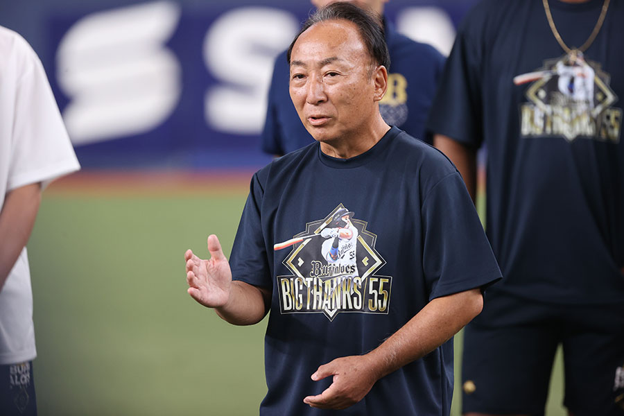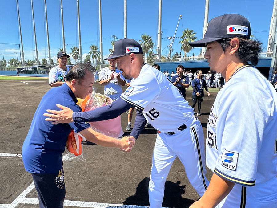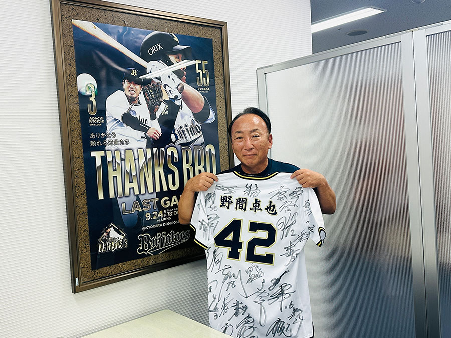 温かな勇退セレモニーだった。9月20日、杉本商事バファローズスタジアム舞洲で行われたウエスタン・リーグ公式戦の試合前、場内にアナウンスが響いた。「特別始球式を行うのは、トレーナーの野間卓也さんです!」。きょとんとする野間トレーナーに、ベンチ前で並んでいた選手の視線が一斉に向けられる。「え、どこ行くの?」「始球式、始球式!」。比嘉幹貴投手に手を引かれる野間トレーナー。選手たちはその期待通りの戸惑いぶりに声を出して笑った。バッターボックスにはT-岡田選手。キャッチャーを務めたのは安達了一選手兼任コーチ。 42年もの間チームを支え続けた野間トレーナーのために、これ以上ないサプライズの舞台が用意されていた。比嘉投手が右手を挙げてプレイボールの合図を送る。野間トレーナーは照れ笑いを浮かべると、ゆるやかにホームベースへ向けて白球を投じた。バファローズベンチ、中日ドラゴンズベンチ、そしてスタンド。球場が一体となって大きな拍手を送った。選手の身体のケアを担い続け、多くの選手に愛された野間トレーナー。これまでの歩みと仕事への思いに迫った。