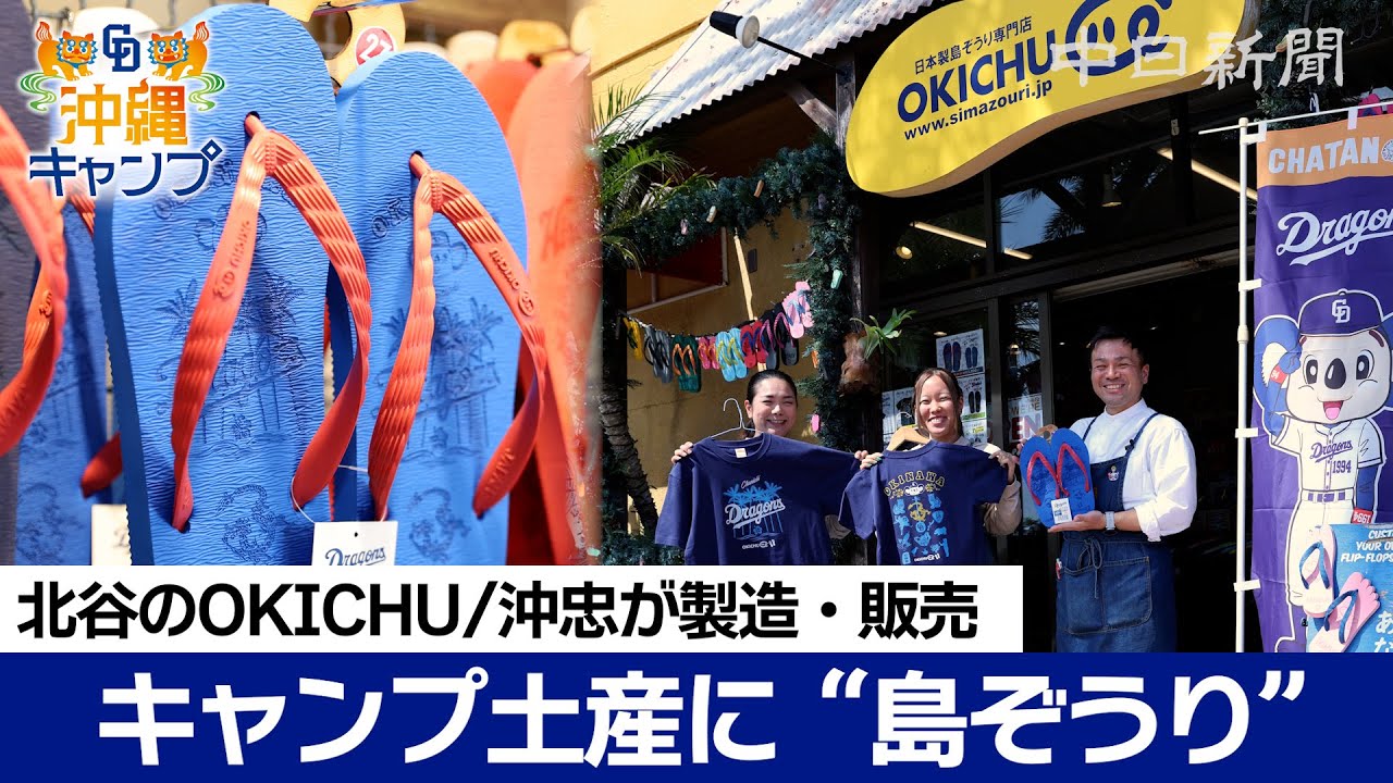 中日ドラゴンズの春季キャンプ地沖縄県北谷町のアメリカンビレッジ内にある島ぞうり専門店OKICHU/沖忠では、ドラゴンズとコラボした島ぞうりやTシャツなどを販売中。島ぞうりとは沖縄県民が日常的に履いているビーチサンダルのことで、沖忠ではオリジナルデザインのカスタムオーダー島ぞうりの製作もしている。営業時間は午前10時から午後9時。1月1日のみ休み。