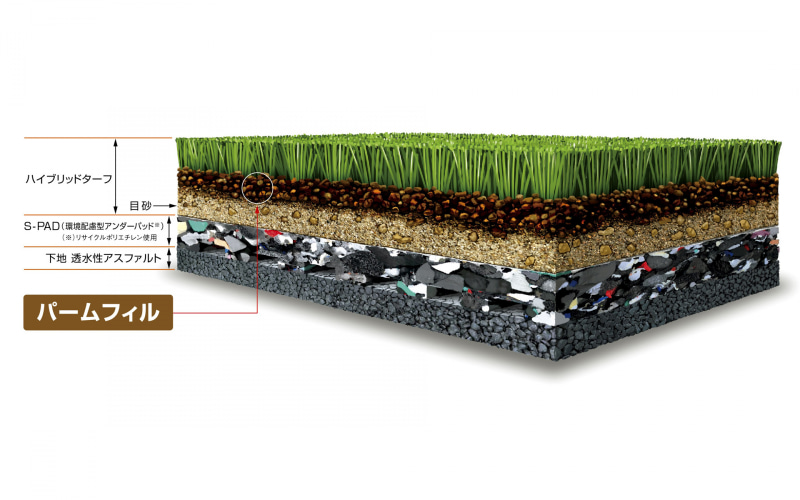 今回の共同開発では、人工芝の表面温度が高温になる課題を改善することに主眼が置かれ、今回、採用した天然素材充填材「Palmfill(パームフィル)」は、保水力に優れた素材で、特に夏場の芝の表面温度抑制に効果を発揮。また、素材自体が土に似た感触のため、より天然芝に近い感覚で、選手の体への負担軽減に貢献。グラウンドに立つ選手の体を守りつつ、パフォーマンスを上げることを目的に、選りすぐりの素材を使用した人工芝システムとしている。